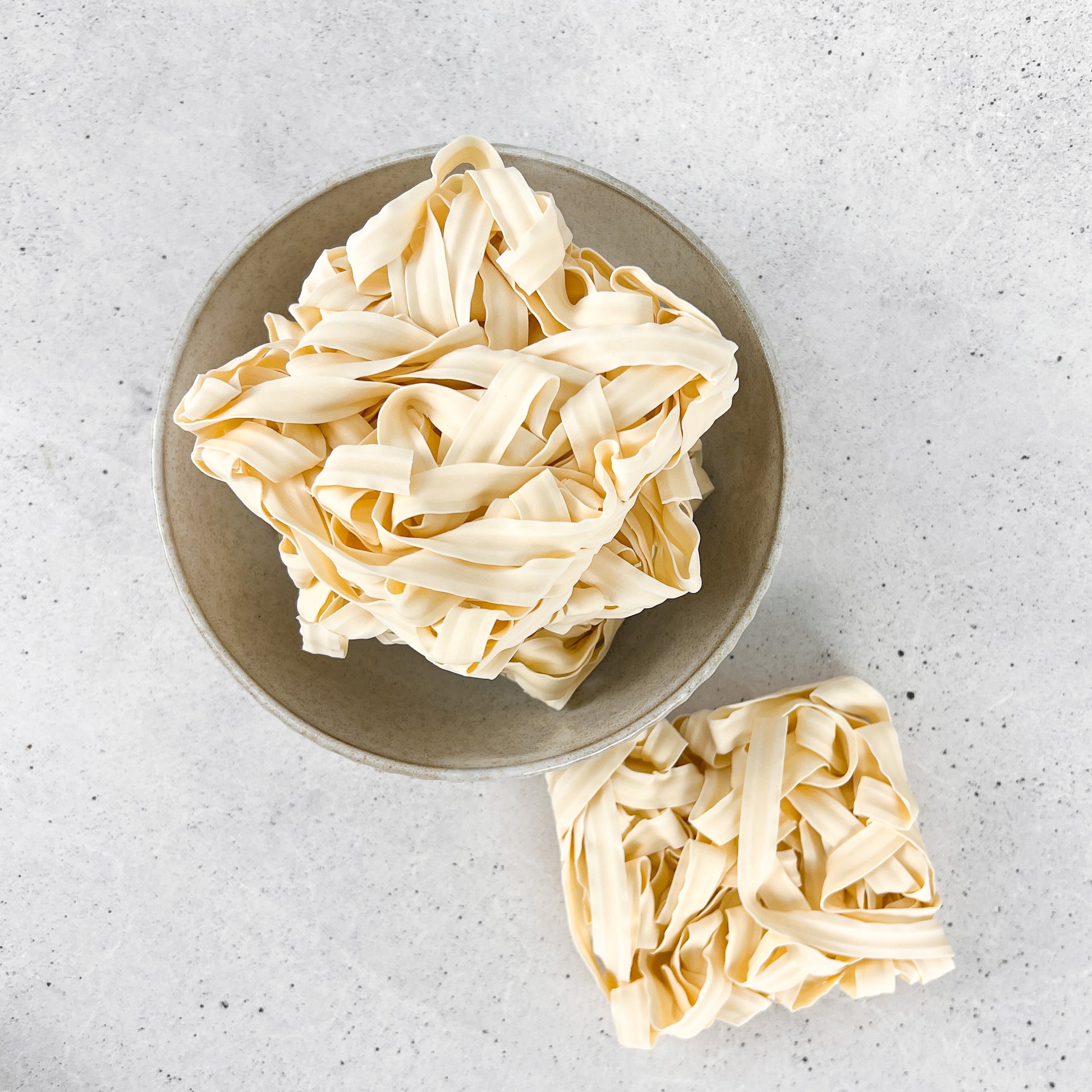 Knife-cut noodles is thick, bouncy with a chewy bite cooked al dente, made to absorb bold, hearty flavours. Can be served dry or in noodle soup. Perfect for bold sauces & broths. 1 serve (1 piece) of this noodle is roughly 65g.