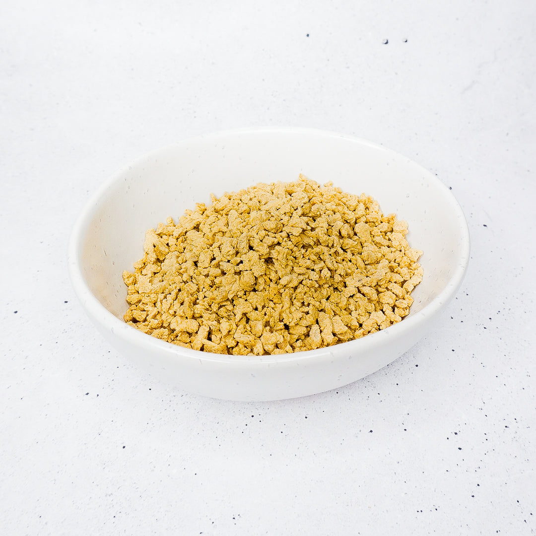This Soy Mince is an excellent substitute for meat. It has a mild flavour and absorbs herbs, spices and broth it is cooked with. Commonly used to be made into veggie burger patties and sausages, you can also use it to made into stir-fries such as Pad Krapow, add it as dumpling fillings or turn them into meatballs. To use this, you would need to rehydrate the Soy Mince by soaking into boiling water for 10 minutes or until soft. Drain water and it is ready to be used.